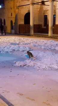 Şanlıurfa’da yoğun kar yağışı nedeniyle kırsalda aç kalan tilki, şehir merkezindeki Balıklıgöl’de yiyecek aradı.