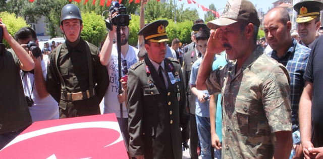 Buradaki tören öncesi şehit olan oğlunun tabutu başına gelen baba Alaaddin Küçük dua ettikten sonra asker selamı durarak ??Allah?ım şahadetini kabul et yarabbi. Vatana millete feda olsun. Hakkım helal olsun. Allah?ım razı olsun? dedi.
