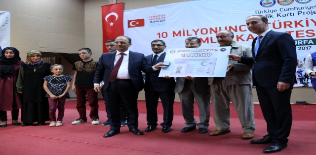 Kolay taşındığı, dayanıklı olduğu ve kopyalanamadığı belirtilen çipli Türkiye Cumhuriyeti kimlik kartlarından sistemden geçen 10 milyonuncusu Şanlıurfa`da sahibine verildi. İçişleri Bakanlığı Nüfus ve Vatandaşlık İşleri Genel Müdürlüğü ve Şanlıurfa Valiliği tarafından GAP Tarımsal Eğitim Merkezi`nde (GAPTEAM) tören düzenlendi. Törende Mehmet Kılıç`a (sağ 2) 10 milyonuncu çipli kimliği verildi.