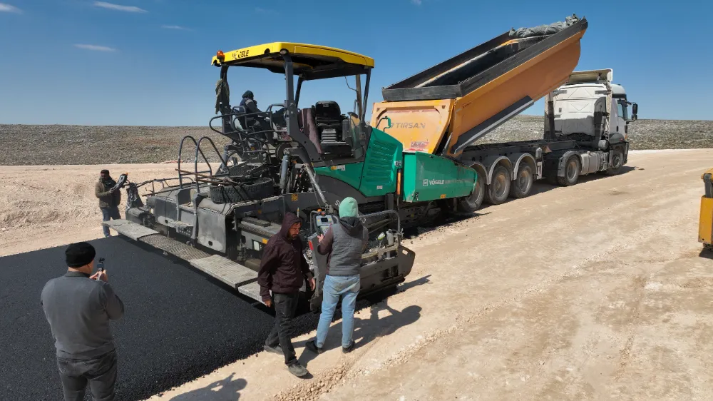 Şanlıurfa Büyükşehir Belediyesi, kırsal ulaşımı güçlendirmek amacıyla Halfeti–Bozova grup yolunda sıcak asfalt çalışmalarını sürdürüyor.