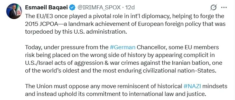 İran Dışişleri Bakanlığı Sözcüsü İsmail Bekayi, ABD ve İsrail'in İran'a yönelik saldırılarına destek veren Avrupa Birliği ülkelerine, "Birlik, tarihsel Nazi zihniyetlerini hatırlatan her türlü harekete karşı çıkmalı ve bunun yerine uluslararası hukuka ve adalete olan bağlılığını sürdürmelidir" çağrısında bulundu.