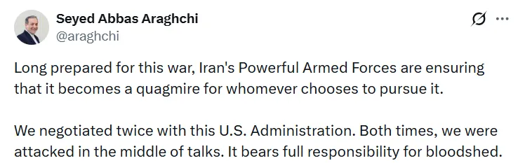 İran Dışişleri Bakanı Abbas Arakçi, sosyal medya hesabından ABD ve İsrail’in ülkesine yönelik saldırıları ile ilgili açıklamalarda bulundu.