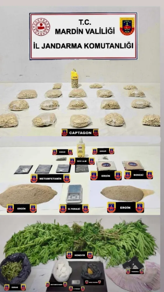 İl Jandarma Komutanlığı Narkotik Şube Müdürlüğü ekiplerince yürütülen çalışmalarda, Mardin, Şanlıurfa ve Diyarbakır illerinde ikamet eden 5 şüpheli gözaltına alındı. Şüphelilere ait adreslerde yapılan aramalarda, 21 bin 157 adet uyuşturucu hap, 1 kilo 240 gram eroin, 1 kilo 80 gram metamfetamin ile uyuşturucu madde ticaretinden elde edildiği değerlendirilen 45 bin lira ele geçirildi. Gözaltına alınan 5 şahıs, sevk edildikleri adli makamlarca tutuklanarak Mardin Kapalı Ceza İnfaz Kurumuna teslim edildi.