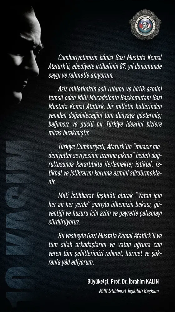 "Cumhuriyetimizin bânisi Gazi Mustafa Kemal Atatürk’ü, ebediyete irtihalinin 87. yıl dönümünde saygı ve rahmetle anıyorum. Aziz milletimizin asil ruhunu ve birlik azmini temsil eden Millî Mücadelenin Başkomutanı Gazi Mustafa Kemal Atatürk, bir milletin küllerinden yeniden doğabileceğini tüm dünyaya göstermiş; bağımsız ve güçlü bir Türkiye idealini bizlere miras bırakmıştır. Türkiye Cumhuriyeti, Atatürk’ün ‘muasır medeniyetler seviyesinin üzerine çıkma’ hedefi doğrultusunda kararlılıkla ilerlemekte; istiklal, istikbal ve istikrarını koruma azmini sürdürmektedir. Millî İstihbarat Teşkilâtı olarak ‘Vatan için her an her yerde’ şiarıyla ülkemizin bekası, güvenliği ve huzuru için azim ve gayretle çalışmayı sürdürüyoruz. Bu vesileyle Gazi Mustafa Kemal Atatürk’ü ve tüm silah arkadaşlarını ve vatan uğruna can veren tüm şehitlerimizi rahmet, hürmet ve şükranla yâd ediyorum."