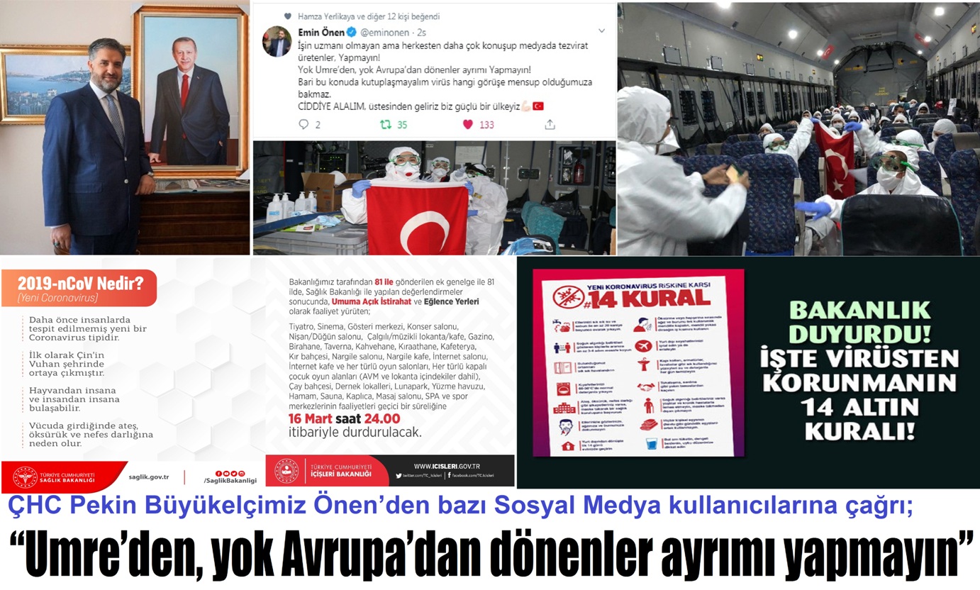 Virüsün bulaşıcı ve insan sağlığının önemli olduğuna dikkat çeken ÇHC Pekin Büyükelçimiz Abdulkadir Emin Önen, “İşin uzmanı olmayan ama herkesten daha çok konuşup medyada tezvirat üretenler, Yapmayın! Yok Umre’den, yok Avrupa’dan dönenler ayrımı yapmayın! Bari bu konuda kutuplaşmayalım, virüs hangi görüşe mensup olduğumuza bakmaz. Ciddiye alalım, üstesinden geliriz, biz güçlü bir ülkeyiz” dedi.