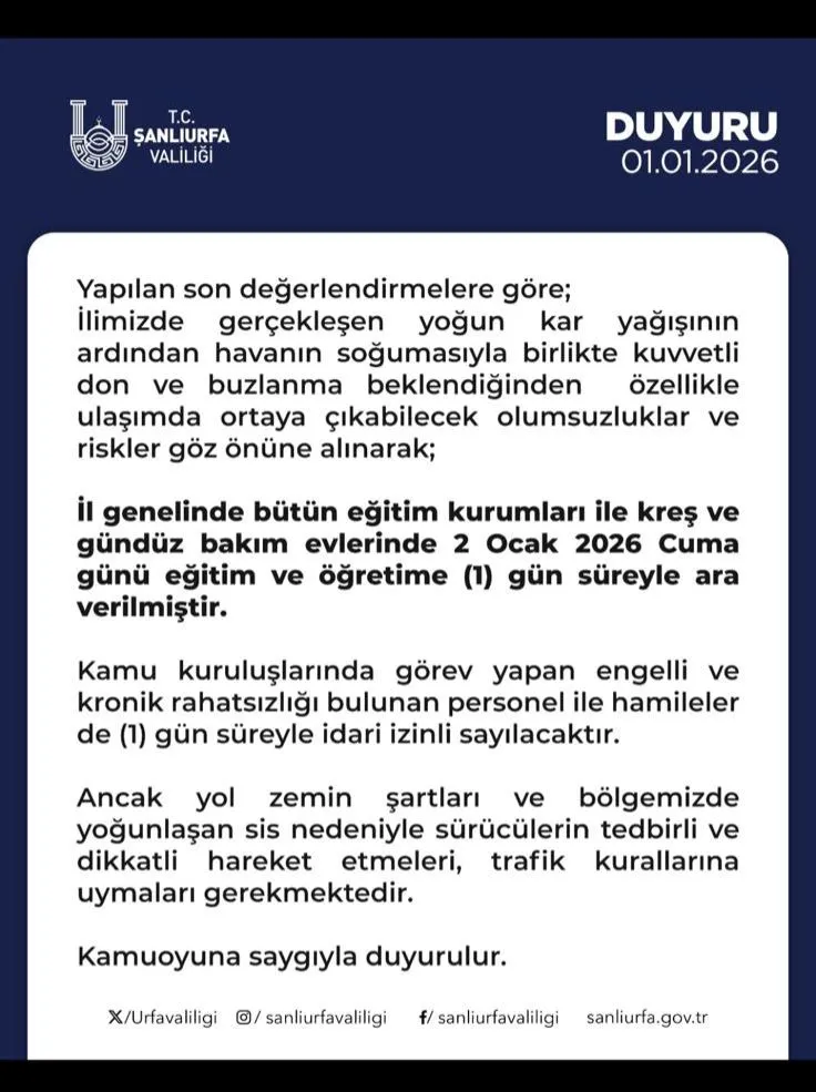 2026 yılının size başarı, sağlık ve güzellikler getirmesini diliyorum. Şanlıurfa’da eğitimi her zaman en öncelikli konu olarak ele alıyor ve sizin en iyi şartlarda eğitim almanız, daha çok başarılı olmanız için çalışıyoruz" diyerek, muhtemel buzlanma ve sis nedeniyle il genelindeki bütün eğitim kurumlarında yarın eğitime ara verildiğini duyurdu.