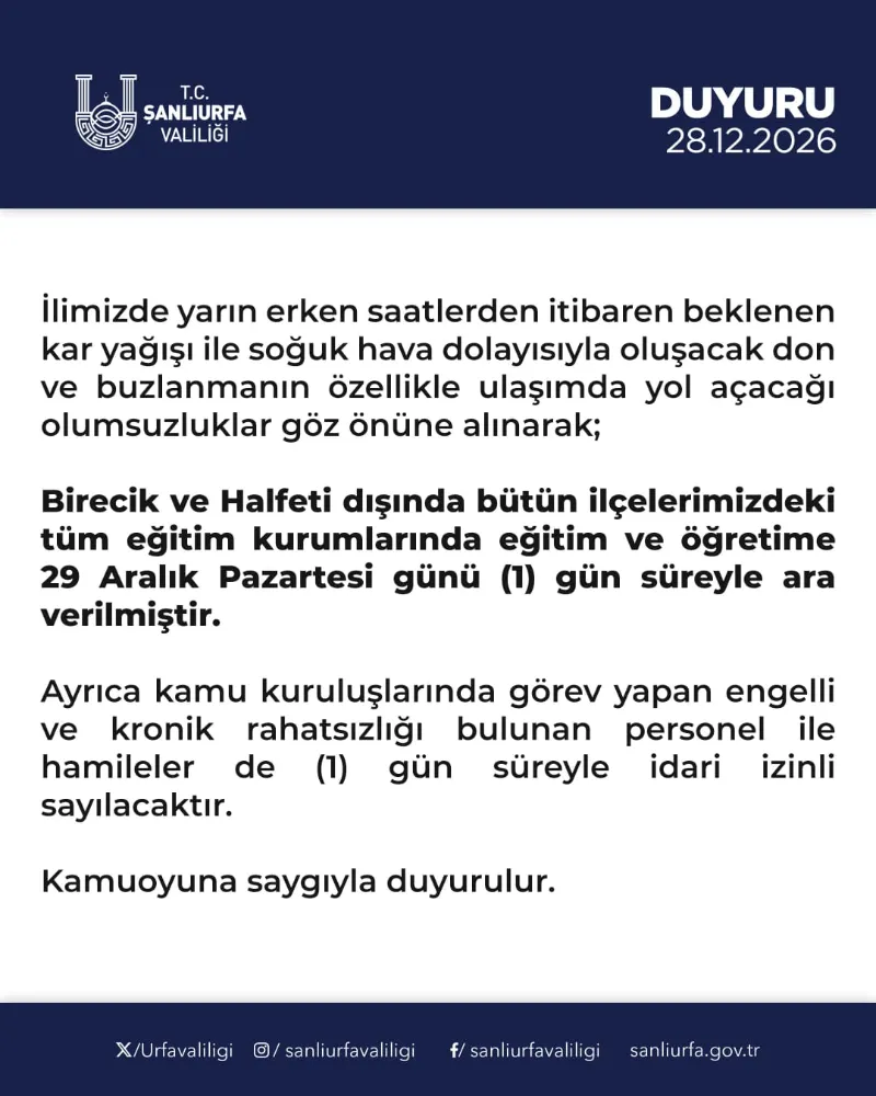 Şanlıurfa Valiliğinden yapılan açıklamada, "İlimizde yarın erken saatlerden itibaren beklenen kar yağışı ile soğuk hava dolayısıyla oluşacak don ve buzlanmanın özellikle ulaşımda yol açacağı olumsuzluklar göz önüne alınarak; Birecik ve Halfeti dışında bütün ilçelerimizdeki tüm eğitim kurumlarında eğitim ve öğretime 29 Aralık Pazartesi günü 1 gün süreyle ara verilmiştir.