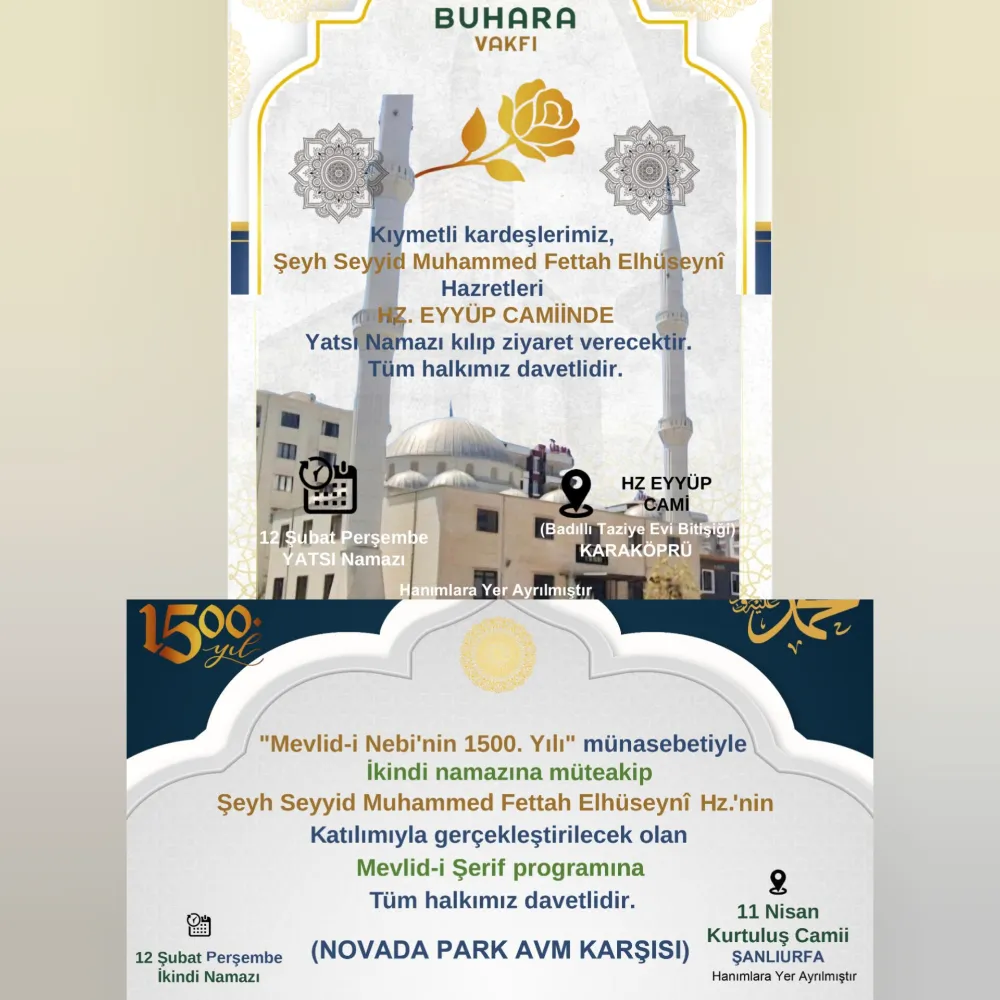Mevlid-i Nebi’nin 1500. yılı münasebetiyle gerçekleştirilecek program kapsamında Hazretleri, farklı camilerde kılınacak namazlara katılarak vatandaşlarla buluşacak. Programa tüm Şanlıurfalılar davet edildi.