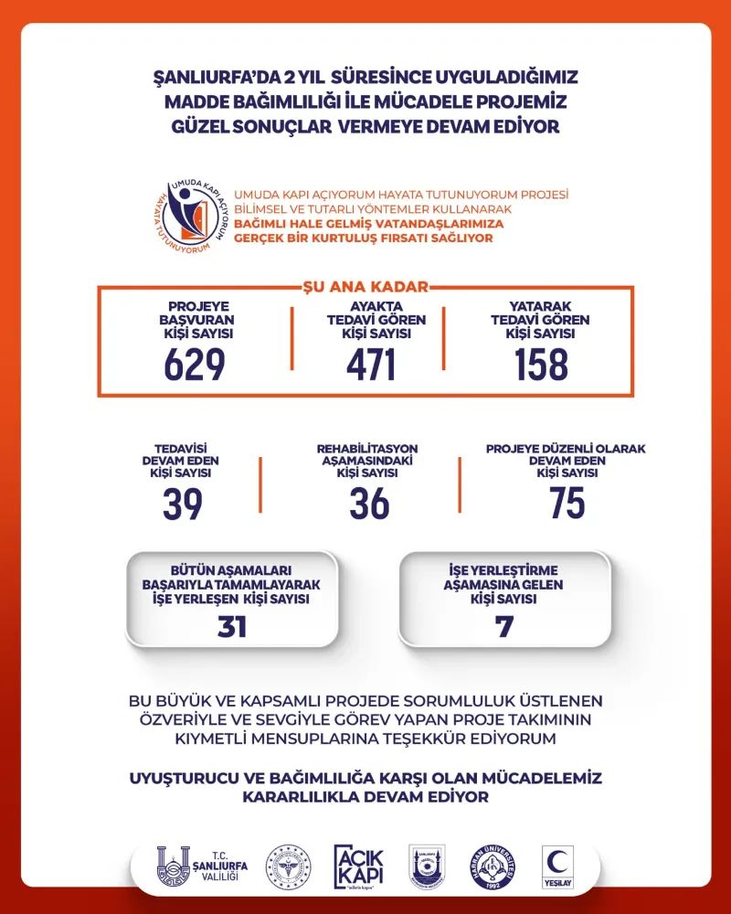 Şanlıurfa’da madde bağımlılığıyla mücadele kapsamında son iki yıldır yürütülen “Umuda Kapı Açıyorum Hayata Tutunuyorum Projesi” olumlu sonuçlar vermeye devam ediyor.