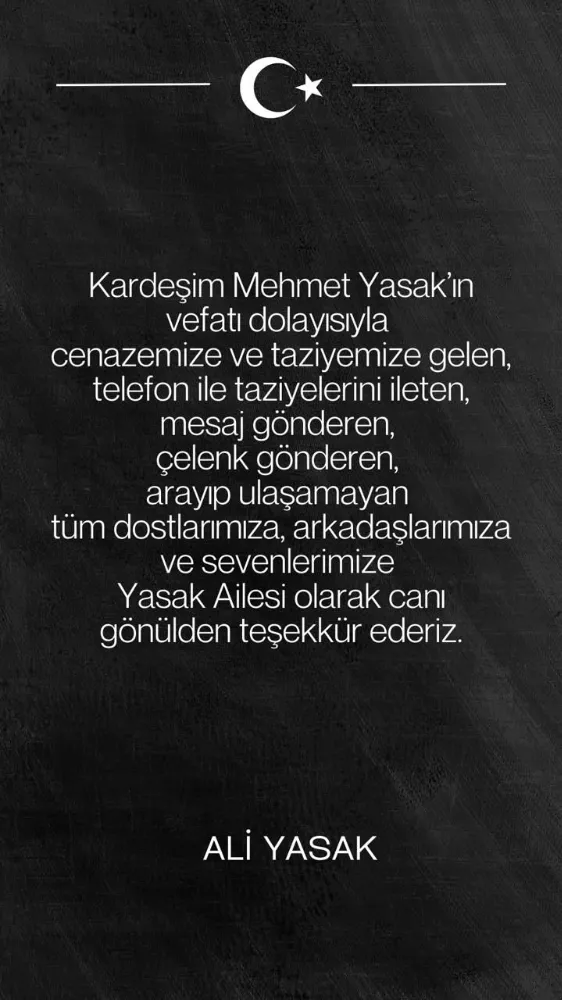 “Cenazemize ve taziyemize gelen, telefon ile taziyelerini ileten, mesaj gönderen, çelenk gönderen, arayıp ulaşamayan tüm dostlarımıza, arkadaşlarımıza ve sevenlerimize Yasak Ailesi olarak can-ı gönülden teşekkür ederiz.”
