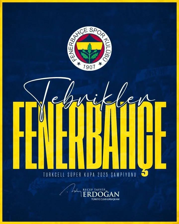 Cumhurbaşkanı Recep Tayyip Erdoğan, Süper Kupa 2025 final maçında Galatasaray'ı 2-0 yenerek şampiyon olan Fenerbahçe'yi kutladı.